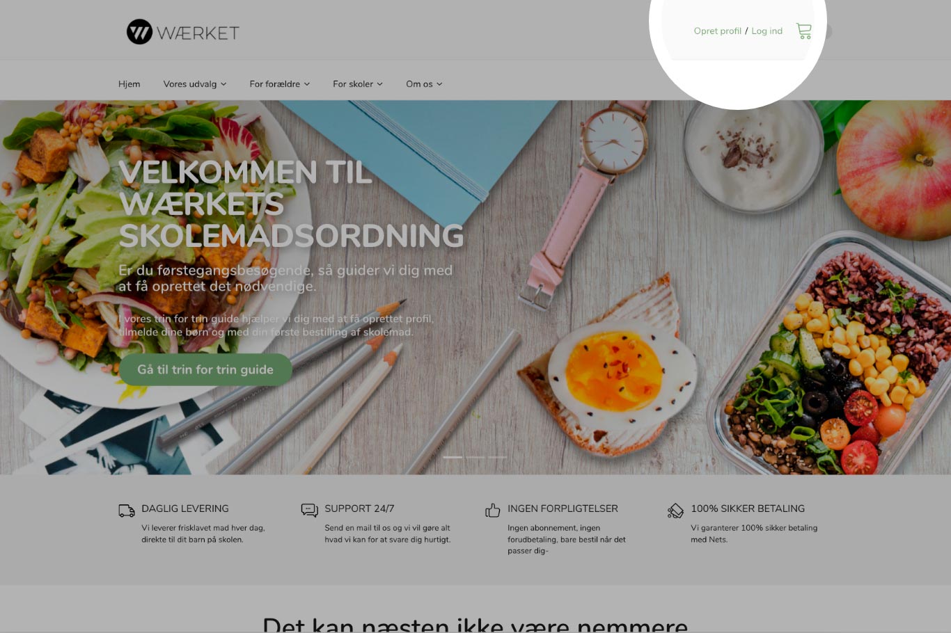 Når din profil og barnets medlemskab er oprettet, er du klar til at bestille skolemad - Klik på 'Start med at bestille skolemad'.