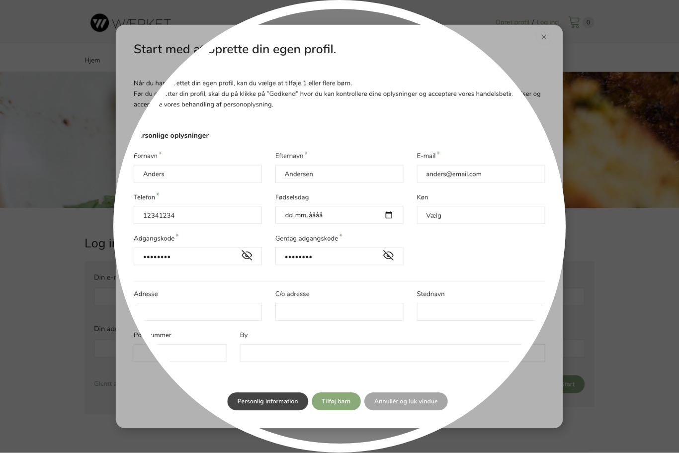 Udfyld nu resten af dine personlige oplysninger. Nogle felter er påkrævede og skal udfyldes. Når du har gjort det, kan du fortsætte ved at klikke på 'Tilføj barn'.